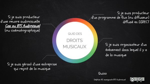 Si le producteur d'une oeuvre audiovisuelle souhaite y inclure une oeuvre musicale déposée sous une LCC, alors le producteur respectera les critères choisis par les auteurs de l'oeuvre musicale (ND No Derivate, NC non Commercial ou SA Share Alike). Le critère de la paternité est obligatoire BY. A la fin de la production, un cue sheet sera complété et remis par le producteur à chaque exploitant (festival, chaîne de télévision, plateforme...) pour l'informer de la LCC. https://www.youtube.com/watch?v=_gxm82vegb4 Au générique, la LCC sera mentionnée (nom des auteurs, titre de l'oeuvre et la LCC) Si l'une des musiques intégrées est une LCC avec le critère SA "partage des conditions à l'identique", alors le producteur audiovisuel devra à son tour déposer son vidéogramme en LCC "mêmes critères". En BTS Audiovisuel, une LCC sous SA ne devra pas être exploitée