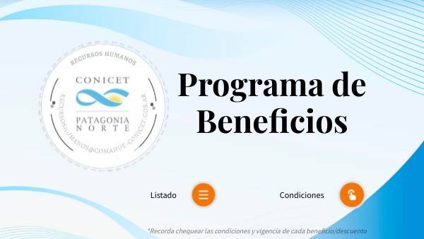 10% descuento pago en efectivo/débito. Si se utiliza otro medio de pago se abona precio de lista presentando la credencial de beneficios de CONICET CCT PN. Vigencia: 31/12/2024