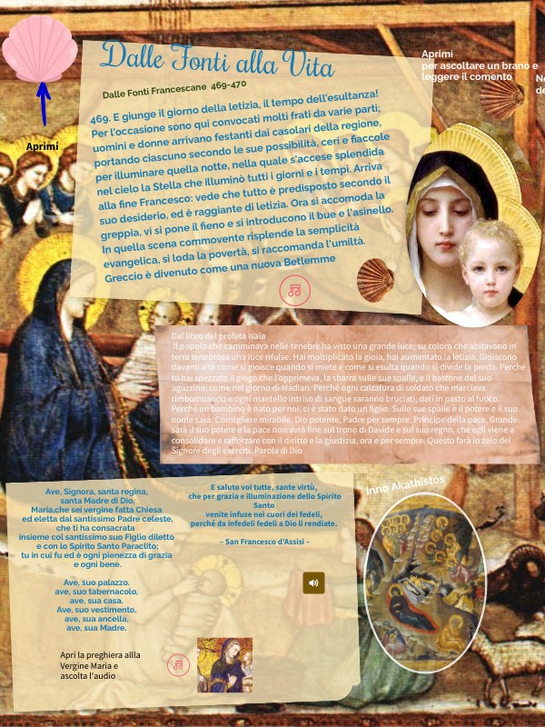 469. E giunge il giorno della letizia, il tempo dell'esultanza! Per l'occasione sono qui convocati molti frati da varie parti; uomini e donne arrivano festanti dai casolari della regione, portando ciascuno secondo le sue possibilità, ceri e fiaccole per illuminare quella notte, nella quale s'accese splendida nel cielo la Stella che illuminò tutti i giorni e i tempi. Arriva alla fine Francesco: vede che tutto è predisposto secondo il suo desiderio, ed è raggiante di letizia. Ora si accomoda la greppia, vi si pone il fieno e si introducono il bue e l'asinello. In quella scena commovente risplende la semplicità evangelica, si loda la povertà, si raccomanda l'umiltà. Greccio è divenuto come una nuova Betlemme