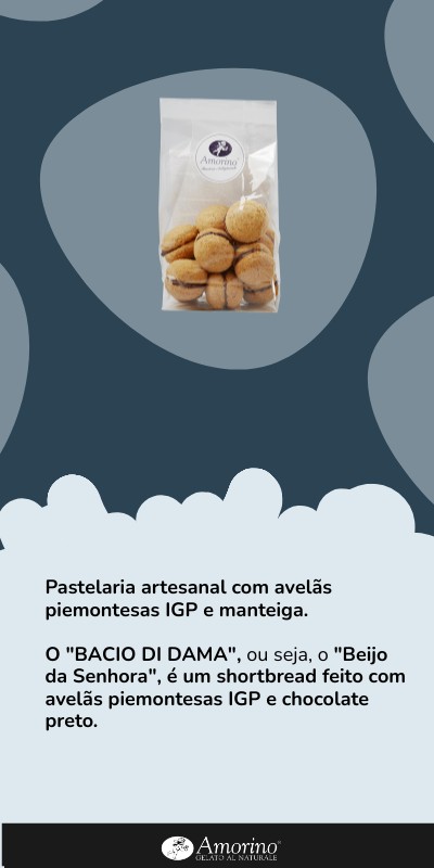 Pastelaria artesanal com avelãs piemontesas IGP e manteiga.O "BACIO DI DAMA", ou seja, o "Beijo da Senhora", é um shortbread feito com avelãs piemontesas IGP e chocolate preto.