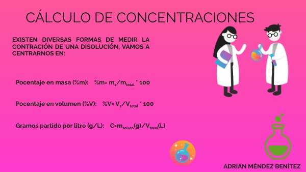 Pocentaje en masa (%m): %m= ms/mtotal * 100 Pocentaje en volumen (%V): %V= Vs/Vtotal * 100 Gramos partido por litro (g/L): C=msoluto(g)/Vtotal(L)
