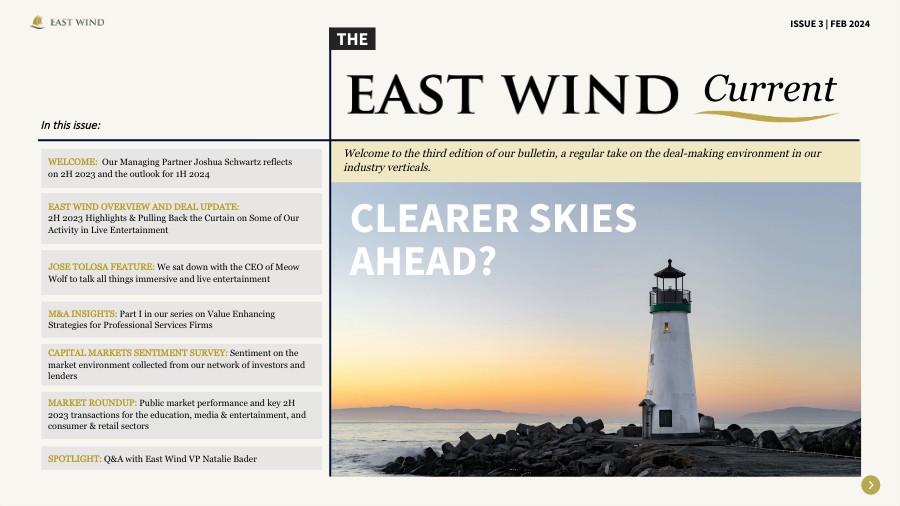 We are pleased to provide you with the latest edition of The East Wind Current, which reviews the last half of 2023 while also providing some forward-looking market sentiment pertaining to where the market may be heading from here. In this edition, I, along with my colleagues Ethan Galiette and Chelsea Chen, speak to a seasoned media & entertainment executive, Jose Tolosa, who now leads a high growth company, Meow Wolf, which has the potential to revolutionize how we think about and consume entertainment IP. Our discussion with Jose occurs against the backdrop of significant deal activity in the live entertainment space for East Wind (see East Wind Deal Update for more information on this and our activity elsewhere in 2H 2023). We also have included a new section, M&A Insights, where David Kaufthal and Jason Birke are recently back from successful experiences in the Professional Services area, and they share their insights on value enhancing strategies. Another new feature is our Market Survey, which contains the results of a survey we conducted within our network of investors and lenders. As we continue this feature and develop more longitudinal data, we believe the insights we can draw from the data will be more meaningful. For now, sentiment appears to skew moderately positive, and the pendulum that had swung so decidedly in favor of profitability at the expense of growth may be beginning to show some signs of reversal. As demonstrated in our Market Roundup section in this issue, the public market performance across many sectors aligns with revenue or EBITDA growth. The Live Entertainment sector stood out this past year with a median revenue growth of 35.0% and median EBITDA growth of 35.6%. Education companies demonstrated notable growth in 2023, with outperformers such as Stride, PowerSchool, Coursera, and Duolingo leading the way. Meanwhile, growth in Value/Mass Retail