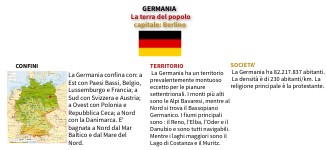 TERRITORIO La Germania ha un territorio prevalentemente montuoso eccetto per le pianure settentrionali. I monti più alti sono le Alpi Bavaresi, mentre al Nord si trova il Bassopiano Germanico. I fiumi principali sono : il Reno, l'Elba, l'Oder e il Danubio e sono tutti navigabili. Mentre i laghi maggiori sono il Lago di Costanza e il Muritz.