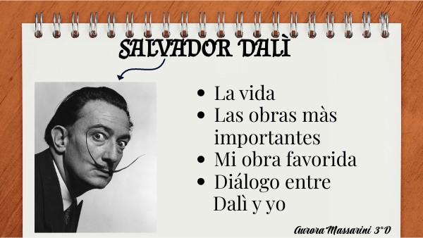 Salvador Dalì nacìo en el 11 mayo de 1904 en Figueres en España y desde muy joven era muy bueno en la pintura; de hecho, comenzò a pintar a los 12 años. A los 18 años se ingresò en la Academia de Bellas Artes de Madrid, pero fue expulsado porque segun èl los profesores no eran capaces de evaluarlo. En 1927 viajò a Parìs, donde conociò a Picasso y gracias a èl, Dalì se uniò al movimento surrealista. En Parìs se enamorò de Gala, y se casaron unos años despues. En 1934 viajaron a los Estados Unidos, donde se trasladaron por 8 años; de 1940 a 1948. Despuès viajò a España, donde muriò el 23 enero de 1989 en Figueres en España, dejando como heredero universal a la España.