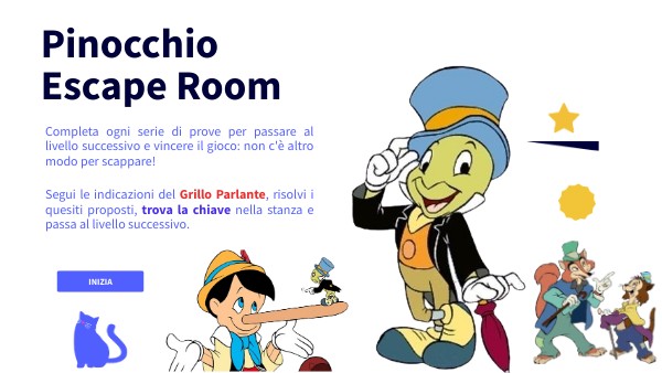 Segui le indicazioni del Grillo Parlante, risolvi i quesiti proposti, trova la chiave nella stanza e passa al livello successivo.