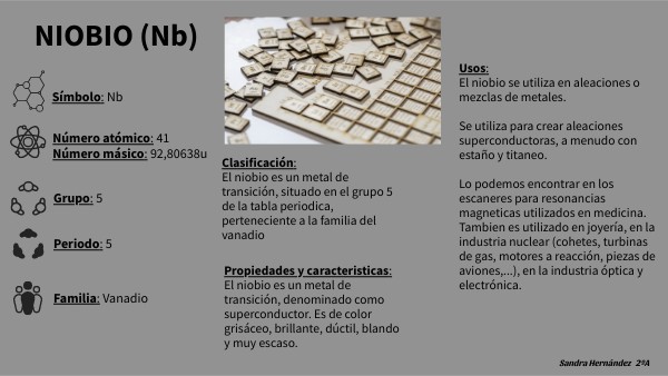 Propiedades y caracteristicas: El niobio es un metal de transición, denominado como superconductor. Es de color grisáceo, brillante, dúctil, blando y muy escaso.
