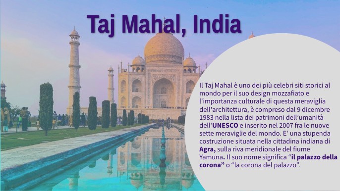 Il Taj Mahal è uno dei più celebri siti storici al mondo per il suo design mozzafiato e l'importanza culturale di questa meraviglia dell'architettura, è compreso dal 9 dicembre 1983 nella lista dei patrimoni dell’umanità dell’UNESCO e inserito nel 2007 fra le nuove sette meraviglie del mondo. E' una stupenda costruzione situata nella cittadina indiana di Agra, sulla riva meridionale del fiume Yamuna. Il suo nome significa “il palazzo della corona” o “la corona del palazzo”.