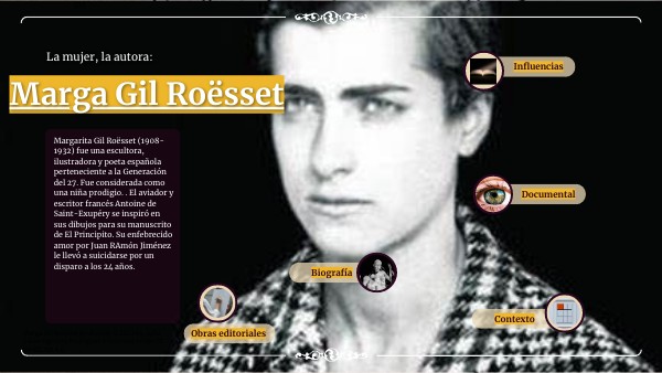 Margarita Gil Roësset (1908-1932) fue una escultora, ilustradora y poeta española perteneciente a la Generación del 27. Fue considerada como una niña prodigio. . El aviador y escritor francés Antoine de Saint-Exupéry se inspiró en sus dibujos para su manuscrito de El Principito. Su enfebrecido amor por Juan RAmón Jiménez le llevó a suicidarse por un disparo a los 24 años.