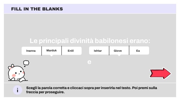 Scegli la parola corretta e cliccaci sopra per inserirla nel testo. Poi premi sulla freccia per proseguire.