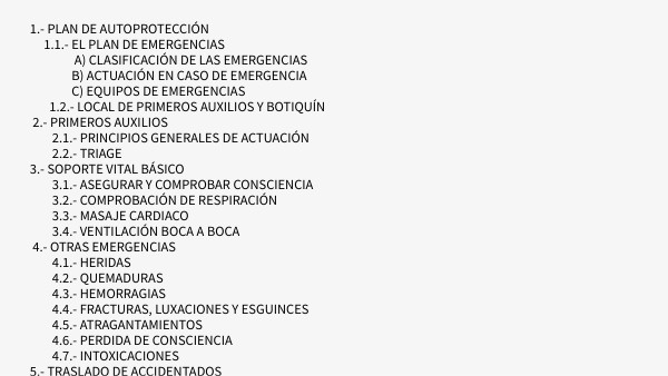 1.- PLAN DE AUTOPROTECCIÓN 1.1.- EL PLAN DE EMERGENCIAS A) CLASIFICACIÓN DE LAS EMERGENCIAS B) ACTUACIÓN EN CASO DE EMERGENCIA C) EQUIPOS DE EMERGENCIAS 1.2.- LOCAL DE PRIMEROS AUXILIOS Y BOTIQUÍN 2.- PRIMEROS AUXILIOS 2.1.- PRINCIPIOS GENERALES DE ACTUACIÓN 2.2.- TRIAGE 3.- SOPORTE VITAL BÁSICO 3.1.- ASEGURAR Y COMPROBAR CONSCIENCIA 3.2.- COMPROBACIÓN DE RESPIRACIÓN 3.3.- MASAJE CARDIACO 3.4.- VENTILACIÓN BOCA A BOCA 4.- OTRAS EMERGENCIAS 4.1.- HERIDAS 4.2.- QUEMADURAS 4.3.- HEMORRAGIAS 4.4.- FRACTURAS, LUXACIONES Y ESGUINCES 4.5.- ATRAGANTAMIENTOS 4.6.- PERDIDA DE CONSCIENCIA 4.7.- INTOXICACIONES 5.- TRASLADO DE ACCIDENTADOS