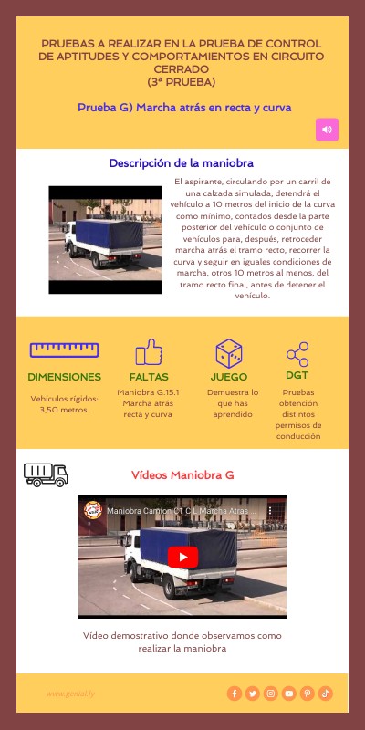 El aspirante, circulando por un carril de una calzada simulada, detendrá el vehículo a 10 metros del inicio de la curva como mínimo, contados desde la parte posterior del vehículo o conjunto de vehículos para, después, retroceder marcha atrás el tramo recto, recorrer la curva y seguir en iguales condiciones de marcha, otros 10 metros al menos, del tramo recto final, antes de detener el vehículo.