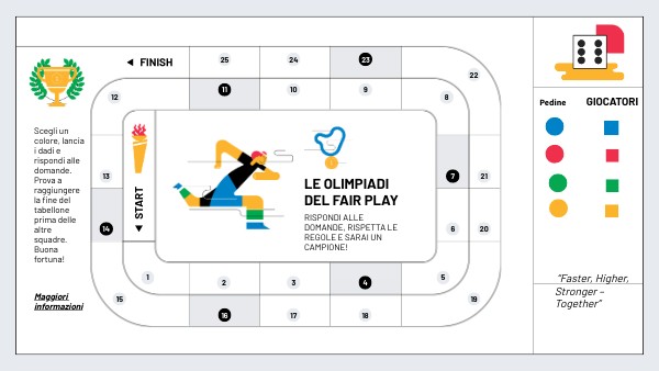 Scegli un colore, lancia i dadi e rispondi alle domande. Prova a raggiungere la fine del tabellone prima delle altre squadre. Buona fortuna!