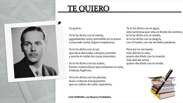 Este texto es un poema escrito por Luis Cernuda, autor de la Generación del 27, y por tanto pertenece al género lírico. Presenta una estructura externa conformada por siete estrofas, la primera está formada por un verso, las cuatro siguientes están formadas por tres versos y las dos útlimas por cinco versos, que se articulan a su vez internamente en el siguiente esquema de ideas: 1. Declaración de amor. 2. Manifestación del amor. 2.1. Utilización de símbolos de la naturaleza.2.2. Utilización de sentimientos.3. Demostración del amor incluso más allá de la muerte y el olvido. (Idea Principal). A partir de estas líneas podemos concluir con que el texto presenta una estructura inductiva, ya que la idea principal, que es la demostración de amor incluso más allá de la muerte y el olvido se encuentra al final del poema.