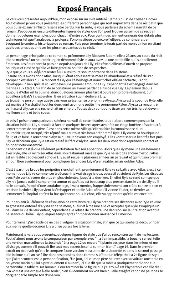 Je vais vous présentez aujourd'hui, mon exposé sur un livre intitulé "Jamais plus" de Colleen Hoover. Tout d'abord je vais vous présentez les différents personnages qui sont importants dans ce récit afin que vous puissiez suivre l'histoire sans être perdu. Par la suite, je vous parlerais du schéma narratif de ce roman. J'évoquerais ensuite différentes figures de styles que l'on peut trouver au sein de ce récit en donnant quelques exemples pour chacun d'entre eux. Pour continuer, je mentionnerais des détails plus techniques tel que l'analepse, la prolepse, l'onomastique ou encore l'ellipse. Je continuerais en évoquant le contexte historique de ce roman. Puis pour terminer je ferais part de mon opinion en citant quelques unes des phrases les plus marquantes de ce récit. Le personnage principale de ce roman se prénomme Lily Blossom Bloom, elle a 23 ans, au cours du récit elle se mariera à un neurochirurgien dénommé Ryle et aura avev lui une petite fille qu'ils appelleront Emerson. Les fleurs sont la passion depuis toujours de Lily, elle rêve d'ailleurs d'ouvrir sa propore boutique et c'est ce qu'elle va faire grace au soutien de ses proches. Ryle que je vous ai déjà présenter à lui aussi toute son importance dans l'histoire. Ensuite nous avons donc Atlas, lorsqu'il était adolescent sa mère l'a abandonné et a refusé de s'en occuper c'est alors qu'il a rencontré Lily qui l'a herbegé et nourrit chez elle en cachette, ils ont développé un lien spécial et il est devenu le premier amour de Lily. Cependant il s'est engagé dans les marines aux Etats Unis afin de se construire un avenir perdant ainsi de vue Lily. La passion depuis toujours d'Atlas est la cuisine, donc quelques années plus tard il ouvre son propre restaurant, qu'il appellera le Bab's ( c'est-à-dire : Bien à Boston ) qu'il dédiera à Lily. Le troisième personnage que je vais vous présenter se prénomme Alyssa, Alyssa est la soeur de Ryle, elle est mariée à Marshall et tout les deux vont avoir une petite fille prénommé Rylee. Alyssa va rencontré par hasard Lily, car elle recherchait un emploi . Toutes deux vont donc tisser un lien très fort et devenir meilleure amie et belle soeur. Je vais à présent vous parlez du schéma narratif de cette histoire, tout d'abord commençons par la situation initiale. Lily s'installe à Boston quelques heures après avoir fait un éloge funèbre désastreux à l'enterrement de son père. C'est dans cette même ville qu'elle va faire la connaissance d'un neurochirurgien occupé, très réputé mais surtout très beau prénommé Ryle. Lily ouvre sa boutique de fleur, et va faire la rencontre d'Alyssa qui veut devenir son employé. Elles vont tisser un lien très fort puis Lily va découvrir que Ryle est en réalité le frère d'Alyssa, ainsi les deux vont donc reprendre contact et finir par sortir ensemble. Cependant c'est là que l'élément pertubateur fait son apparition. Alors que Lily mène une vie heureuse avec Ryle, elle va recroiser Atlas dans son restaurant mais ce que Ryle ne sait pas encore c'est qu'Atlas est en réalité l'adolescent sdf que Lily avait recueilli plusieurs années au paravant et qui fut son premier amour. Bien évidemment pour compliquer les choses Lily n'a en réalité jamais oublier Atlas. C'est à partir de là que les péripéties s'enchaînent, premièrement Ryle va se battre avec Atlas, c'est à ce moment que Lily va commencer à découvrir le vrai visage jaloux, possesif et violent de Ryle. Les disputes avec Ryle vont s'avérer de plus en plus violentes, jusqu'à la dernière. En effet Ryle se rend comtpe que Lily n'a jamais oublié son premier amour et qu'Atlas est beaucoup plus présent dans le vie de Lily qu'il ne le pensait, frappé d'une soudaine rage, il va la mordre, frappé violemment son crâne contre le sien et tenté de la violer. Lily parvient à s'échapper et apelle Atlas afin qu'il vienne l'aider, ce dernier va l'emmener à l'hopital et c'est la-bas qu'encore sous le choc, elle va apprendre qu'elle est enceinte. Pour parvenir à l'élément de résolution de cette histoire, Lily va prendre ses distances avec Ryle et vivre sa grossesse entouré d'Alyssa et de sa mère, au fur et à mesure elle va accepter que Ryle s'implique un peu dans la vie de leur enfant, cependant elle refuse de prendre une décision sur leur relation avant la naissance du bébé. Lily quelques temps après finit par donner naissance à Emerson. Pour terminer, j'ai décidé de ne pas divulguer la situation finale, afin que ce qui souhaite découvrir par eux même quelle décision Lily a prise puisse lire le livre. Maintenant je vais vous présentez quelques figures de style que j'ai pu rencontrer au fil de ma lecture. Tout d'abord nous avons la comparaison par exemple avec "Il a l'air impassible, la bouche serrée, telle une version masculine de la Joconde" à la page 12 ou encore "Il plante ses yeux dans les miens et me dévisage, comme s'il pouvait lire tout mes secrets inscrits sur mon front." page 16. Dans le premier extrait on peut voir qu'elle le compare à une version masculine de la Joconde et dans le second passage elle insinue qu'il arrive à lire dans ses pensées donc comme si c'était un télépathe.La 2e figure de style que j'ai rencontrer est la personnification, "Un jour, j'ai vu mon père heurter avec sa voiture une table en polymère marin qui lui a pratiquement ri au nez", ici elle dit que la table a pratiquement ri donc elle personnifie la table tel un humain. Pour terminer la 3e figure que j'ai trouvé est l'hyperbole car elle dit : "Sa voix est une drogue à elle seule", bien évidemment on voit bien qu'elle exagère car on ne peut pas se dorguer par le simple son d'une voix.