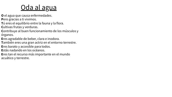 O el agua que causa enfermedades. Pero gracias a ti vivimos. Tú eres el equilibrio entre la fauna y la flora. Cultivas frutas y verduras. Contribuye al buen funcionamiento de los músculos y órganos. Eres agradable de beber, clara e inodora. También eres una gran actriz en el entorno terrestre. Eres barato y accesible para todos. Estás nadando en los océanos. Eres tan el recurso más importante en el mundo acuático y terrestre.
