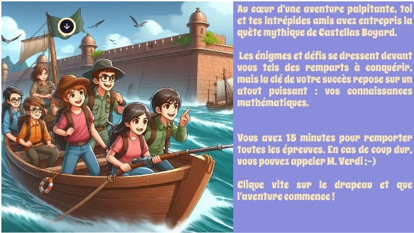 Au cœur d'une aventure palpitante, toi et tes intrépides amis avez entrepris la quête mythique de Castellas Boyard. Les énigmes et défis se dressent devant vous tels des remparts à conquérir, mais la clé de votre succès repose sur un atout puissant : vos connaissances mathématiques. Vous avez 15 minutes pour remporter toutes les épreuves. En cas de coup dur, vous pouvez appeler M. Verdi ;-) Clique vite sur le drapeau et que l'aventure commence !