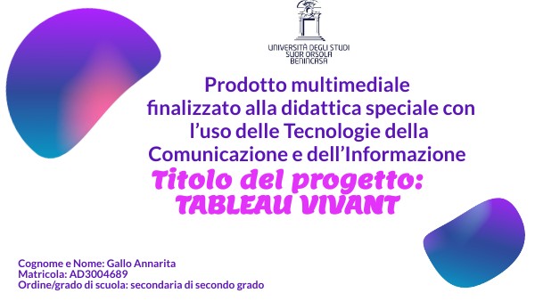Il progetto TABLEAU VIVANT sarà un progetto interdisciplinare tra le docenti di storia dell'arte e di architettura ed ambiente. Avrà come finalità lo sviluppo e il potenziamento della capacità di osservazione e lettura dell’opera. Gli obiettivi disciplinari che spero si raggiungeranno sono la conoscenza degli autori, delle opere d'arte, dello stile, del periodo storico e della tecnica esecutiva. Gli obiettivi trasversali invece saranno l'esperienza teatrale (attraverso la realizzazione vera e propia di quadri a soggetto unico di facile realizzazione e che daranno importanza a ciascun attore), la creatività, attività metacognitive per far acquisire strategie di lettura, abilità e metodo di lavoro/studio ai fini di una maggiore autonomia operativa e sviluppo del pensiero critico.I prodotti multimedialei che inserirò in questo progetto avranno la funzione di valutazione dello studio degli autori e delle opere d'arte che i ragazzi successivamente realizzeranno (Socrative) e di autovalutazione sullo svolgimeto del progetto (Mentimeeter). Oltre alla valutazione attraverso il test i ragazzi saranno valutati anche con una scheda di valutazione al termine del lavoro.