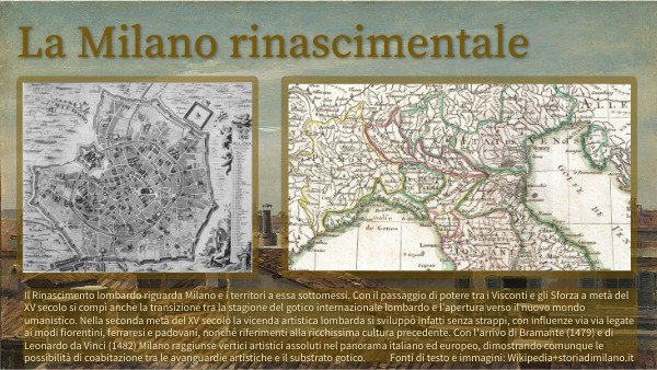Il Rinascimento lombardo riguarda Milano e i territori a essa sottomessi. Con il passaggio di potere tra i Visconti e gli Sforza a metà del XV secolo si compì anche la transizione tra la stagione del gotico internazionale lombardo e l'apertura verso il nuovo mondo umanistico. Nella seconda metà del XV secolo la vicenda artistica lombarda si sviluppò infatti senza strappi, con influenze via via legate ai modi fiorentini, ferraresi e padovani, nonché riferimenti alla ricchissima cultura precedente. Con l'arrivo di Bramante (1479) e di Leonardo da Vinci (1482) Milano raggiunse vertici artistici assoluti nel panorama italiano ed europeo, dimostrando comunque le possibilità di coabitazione tra le avanguardie artistiche e il substrato gotico. Fonti di testo e immagini: Wikipedia+storiadimilano.it