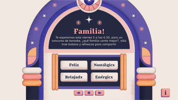 Te esperamos este viernes 5 a las 6:30, para un concurso de karaoke, ¿qué familia canta mejor?, sólo trae botana y refrescos para compartir
