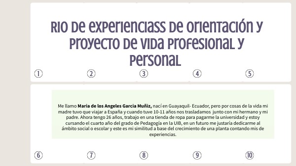 Me llamo Maria de los Angeles Garcia Muñiz, nací en Guayaquil- Ecuador, pero por cosas de la vida mi madre tuvo que viajar a España y cuando tuve 10-11 años nos trasladamos junto con mi hermano y mi padre. Ahora tengo 26 años, trabajo en una tienda de ropa para pagarme la universidad y estoy cursando el cuarto año del grado de Pedagogía en la UIB, en un futuro me justaría dedicarme al ámbito social o escolar y este es mi similitud a base del crecimiento de una planta contando mis de experiencias.