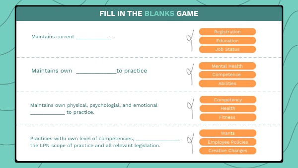 A fill in the blanks game for the BCCNM's Practice Standards 1: Professional Responsibility and Accountability