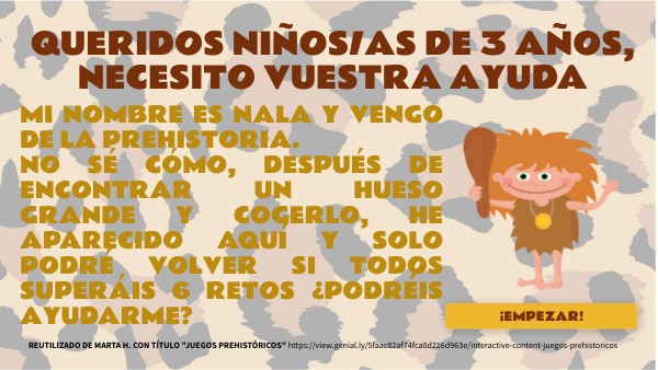 MI NOMBRE ES NALA Y VENGO DE LA PREHISTORIA. NO SÉ CÓMO, DESPUÉS DE ENCONTRAR UN HUESO GRANDE Y COGERLO, HE APARECIDO AQUÍ Y SOLO PODRÉ VOLVER SI TODOS SUPERÁIS 6 RETOS ¿PODRÉIS AYUDARME?