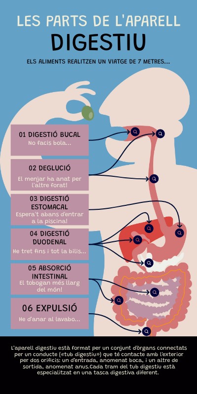 L’aparell digestiu està format per un conjunt d'òrgans connectats per un conducte («tub digestiu») que té contacte amb l'exterior per dos orificis: un d’entrada, anomenat boca, i un altre de sortida, anomenat anus.Cada tram del tub digestiu està especialitzat en una tasca digestiva diferent.