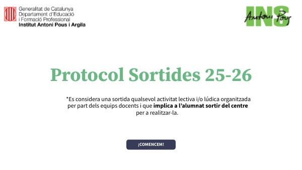 *Es considera una sortida qualsevol activitat lectiva i/o lúdica organitzada per part dels equips docents i que implica a l’alumnat sortir del centre. Cal que estiguin aprovades prèviament pel Consell Escolar per a poder-les dur a terme. Programar les sortides per departaments (fixant preus, dates, horaris, alumnat i professorat implicat) durant les dues primeres setmanes de setembre dins l’excel TALLERS, SORTIDES I ACTIVITATS 23-24. NO es pot trepitjar/coincidir amb altres sortides del centre. Cal consultar Calendar Les sortides cal que tinguin relació amb les activitats curriculars planificades i quedin degudament justificades. Cal ajustar-se al context socioeconòmic del centre i les seves característiques.