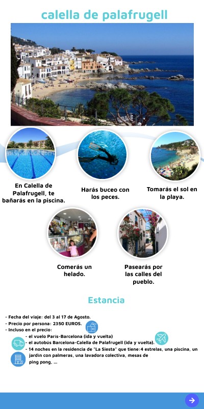- Fecha del viaje: del 3 al 17 de Agosto.- Precio por persona: 2350 EUROS. - Incluso en el precio: - el vuelo París-Barcelona (ida y vuelta) - el autobús Barcelona-Calella de Palafrugell (ida y vuelta). - 14 noches en la residencia de "La Siesta" que tiene:4 estrelas, una piscina, un jardín con palmeras, una lavadora colectiva, mesas de ping pong, ...