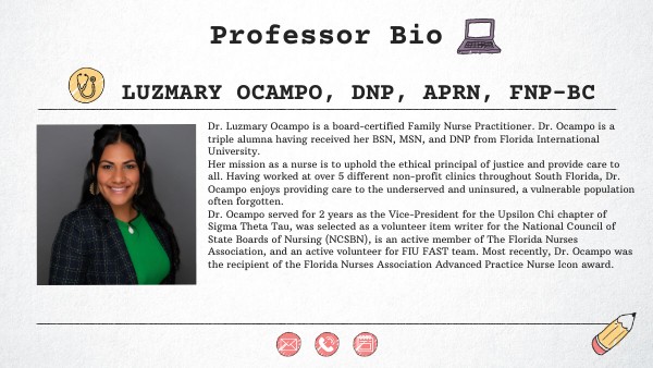 Dr. Luzmary Ocampo is a board-certified Family Nurse Practitioner. Dr. Ocampo is a triple alumna having received her BSN, MSN, and DNP from Florida International University. Her mission as a nurse is to uphold the ethical principal of justice and provide care to all. Having worked at over 5 different non-profit clinics throughout South Florida, Dr. Ocampo enjoys providing care to the underserved and uninsured, a vulnerable population often forgotten. Dr. Ocampo served for 2 years as the Vice-President for the Upsilon Chi chapter of Sigma Theta Tau, was selected as a volunteer item writer for the National Council of State Boards of Nursing (NCSBN), is an active member of The Florida Nurses Association, and an active volunteer for FIU FAST team. Most recently, Dr. Ocampo was the recipient of the Florida Nurses Association Advanced Practice Nurse Icon award.