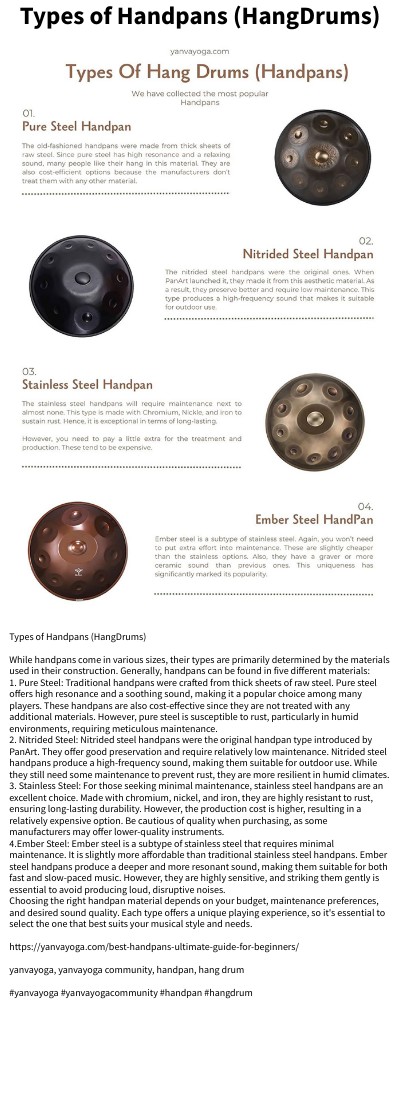 Types of Handpans (HangDrums) While handpans come in various sizes, their types are primarily determined by the materials used in their construction. Generally, handpans can be found in five different materials: 1. Pure Steel: Traditional handpans were crafted from thick sheets of raw steel. Pure steel offers high resonance and a soothing sound, making it a popular choice among many players. These handpans are also cost-effective since they are not treated with any additional materials. However, pure steel is susceptible to rust, particularly in humid environments, requiring meticulous maintenance. 2. Nitrided Steel: Nitrided steel handpans were the original handpan type introduced by PanArt. They offer good preservation and require relatively low maintenance. Nitrided steel handpans produce a high-frequency sound, making them suitable for outdoor use. While they still need some maintenance to prevent rust, they are more resilient in humid climates. 3. Stainless Steel: For those seeking minimal maintenance, stainless steel handpans are an excellent choice. Made with chromium, nickel, and iron, they are highly resistant to rust, ensuring long-lasting durability. However, the production cost is higher, resulting in a relatively expensive option. Be cautious of quality when purchasing, as some manufacturers may offer lower-quality instruments. 4.Ember Steel: Ember steel is a subtype of stainless steel that requires minimal maintenance. It is slightly more affordable than traditional stainless steel handpans. Ember steel handpans produce a deeper and more resonant sound, making them suitable for both fast and slow-paced music. However, they are highly sensitive, and striking them gently is essential to avoid producing loud, disruptive noises. Choosing the right handpan material depends on your budget, maintenance preferences, and desired sound quality. Each type offers a unique playing experience, so it's essential to select the one that best suits your musical style and needs. https://yanvayoga.com/best-handpans-ultimate-guide-for-beginners/ yanvayoga, yanvayoga community, handpan, hang drum #yanvayoga #yanvayogacommunity #handpan #hangdrum