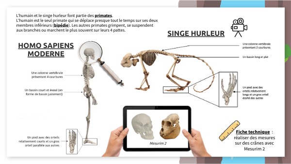 L'humain et le singe hurleur font partie des primates. L'humain est le seul primate qui se déplace presque tout le temps sur ses deux membres inférieurs (bipédie). Les autres primates grimpent, se suspendent aux branches ou marchent le plus souvent sur leurs 4 pattes.
