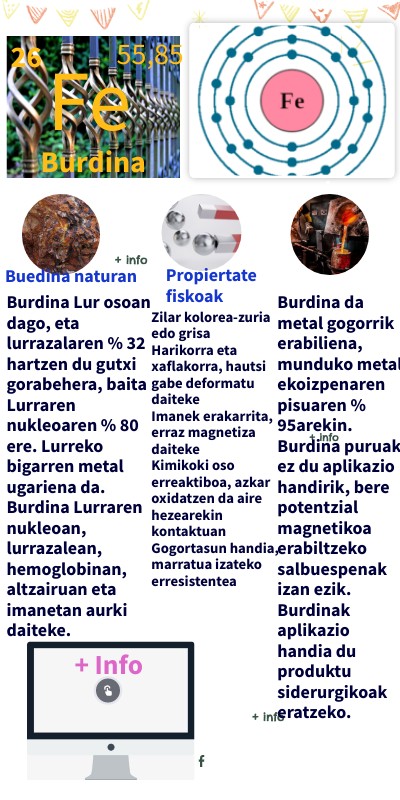 Burdina Lur osoan dago, eta lurrazalaren % 32 hartzen du gutxi gorabehera, baita Lurraren nukleoaren % 80 ere. Lurreko bigarren metal ugariena da. Burdina Lurraren nukleoan, lurrazalean, hemoglobinan, altzairuan eta imanetan aurki daiteke.
