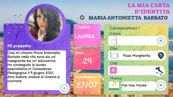 Ciao mi chiamo Maria Antonietta Barbato nella vita sono sia un' insegnante sia un' educatrice. Ho conseguito la laurea specialistica in Consulenza Pedagogica il 9 giugno 2021. Amo ballare, andare al cinema e cucinare.