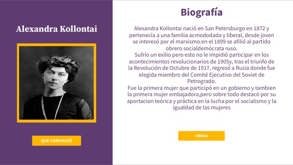 Alexandra Kollontai nació en San Petersburgo en 1872 y pertenecía a una familia acmododada y liberal, desde joven se interesó por el marxismo.en el 1899 se afilió al partido obrero socialdemócrata ruso. Sufrío un exilio pero esto no le impidió participar en los acontecimientos revolucionarios de 1905y, tras el triunfo de la Revolución de Octubre de 1917, regresó a Rusia donde fue elegida miembro del Comité Ejecutivo del Soviet de Petrogrado. Fue la primera mujer que participó en un gobierno y tambien la primera mujer embajadora,pero sobre todo destacó por su aportacion teórica y práctica en la lucha por el socialismo y la igualdad de las mujeres