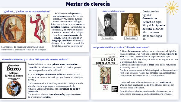 Destacan dos figuras:Gonzalo de Berceo en siglo XIII y el Arcipreste de Hita, autor del libro de buen amor en el siglo XIV.