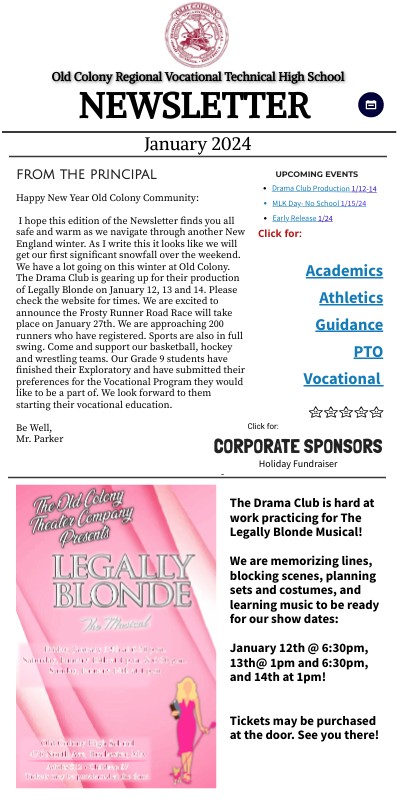 Happy New Year Old Colony Community: I hope this edition of the Newsletter finds you all safe and warm as we navigate through another New England winter. As I write this it looks like we will get our first significant snowfall over the weekend. We have a lot going on this winter at Old Colony. The Drama Club is gearing up for their production of Legally Blonde on January 12, 13 and 14. Please check the website for times. We are excited to announce the Frosty Runner Road Race will take place on January 27th. We are approaching 200 runners who have registered. Sports are also in full swing. Come and support our basketball, hockey and wrestling teams. Our Grade 9 students have finished their Exploratory and have submitted their preferences for the Vocational Program they would like to be a part of. We look forward to them starting their vocational education. Be Well, Mr. Parker -