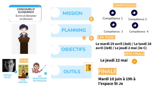 -Vous rédigerez votre discours en respectant la structure attendue -Vous vous entraînerez à déclamer votre discours avec éloquence -Vous déclamerez votre discours lors du 1er tour du concours devant un jury de quatre personnes