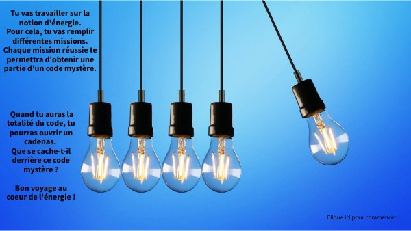 Tu vas travailler sur la notion d'énergie. Pour cela, tu vas remplir différentes missions. Chaque mission réussie te permettra d'obtenir une partie d'un code mystère.