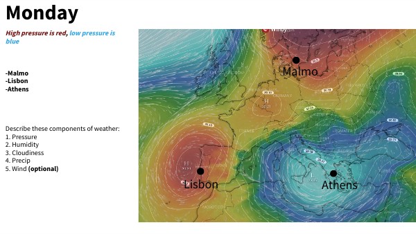 High pressure is red, low pressure is blue -Malmo -Lisbon -Athens Describe these components of weather: 1. Pressure 2. Humidity 3. Cloudiness 4. Precip 5. Wind (optional)