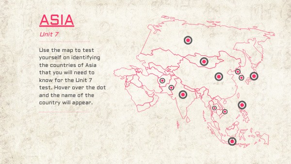 Use the map to test yourself on identifying the countries of Asia that you will need to know for the Unit 7 test. Hover over the dot and the name of the country will appear.