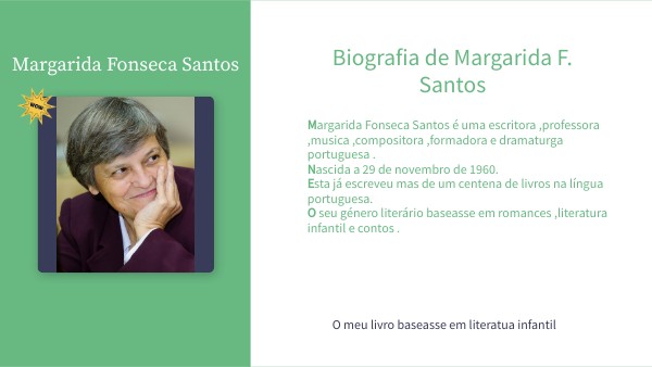 Margarida Fonseca Santos é uma escritora ,professora ,musica ,compositora ,formadora e dramaturga portuguesa .Nascida a 29 de novembro de 1960. Esta já escreveu mas de um centena de livros na língua portuguesa. O seu género literário baseasse em romances ,literatura infantil e contos .