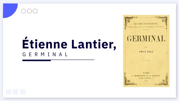 1) Né dans une famille ouvrière. Étienne Lantier vient d'un milieu modeste et a grandi dans la pauvreté. 2) Engagement dans le mouvement ouvrier. Ivre de justice sociale, Lantier se bat pour les droits des travailleurs. 3) Parcours tragicomique. Il connaît des hauts et des bas, d'abord ouvrier, puis leader syndical et révolutionnaire. 4) Étienne Lantier et l’amour