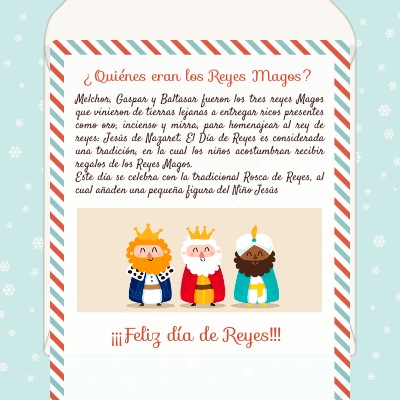 Melchor, Gaspar y Baltasar fueron los tres reyes Magos que vinieron de tierras lejanas a entregar ricos presentes como oro, incienso y mirra, para homenajear al rey de reyes: Jesús de Nazaret. El Día de Reyes es considerada una tradición, en la cual los niños acostumbran recibir regalos de los Reyes Magos.Este día se celebra con la tradicional Rosca de Reyes, al cual añaden una pequeña figura del Niño Jesús