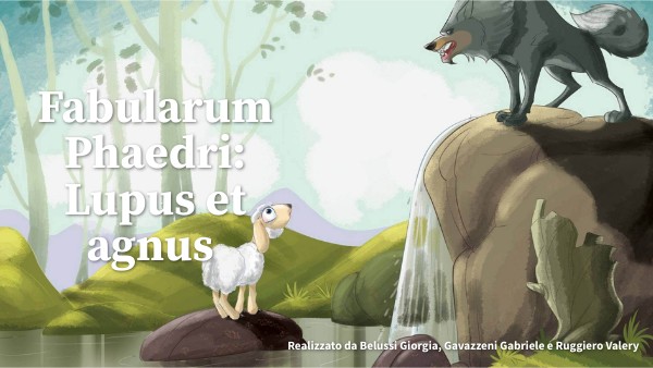 Verso lo stesso ruscello spinti dalla sete erano giunti un lupo e un agnello; Più in alto si trovava il lupo e molto più in basso l'agnello. Allora il malvagio predatore spinto dalla gola introdusse un pretesto di lite. "Perché", disse, “Mi hai reso torbida l'acqua che bevo?” L'agnello di fronte impaurito: "Come posso, di grazia, fare ciò di cui ti lamenti, o lupo? Da te l'acqua scorre giù fino al luogo in cui io bevo”. Quello contraddetto dalla forza della verità: “Sei mesi fa”, disse, “Hai parlato male di me”. L'agnello rispose:”In verità non ero ancora nato”. “Per Ercole, fu tuo padre, dice quello, a parlare male di me”; e così afferrato l'agnello lo sbrana per mezzo di un ingiusta morte. Questa favola è stata scritta a causa di quegli uomini che opprimono gli innocenti per mezzo di false accuse.