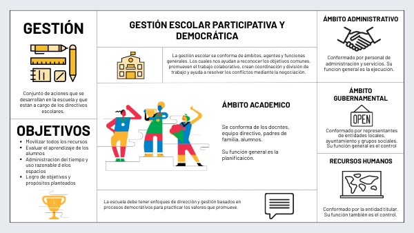 La gestión escolar se conforma de ámbitos, agentes y funciones generales. Los cuales nos ayudan a reconocer los objetivos comunes, promueven el trabajo colaborativo, crean coordinación y división de trabajo y ayuda a resolver los conflictos mediante la negociación.