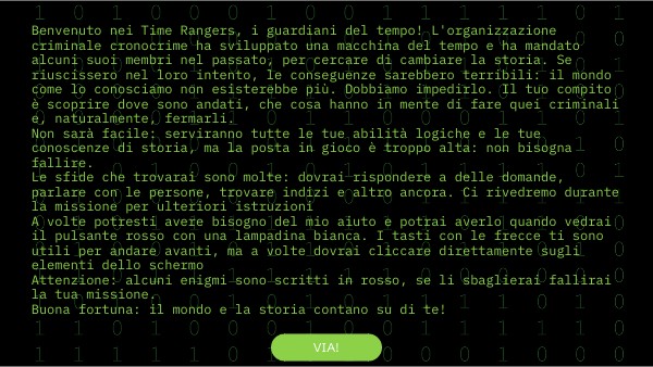 Benvenuto nei Time Rangers, i guardiani del tempo! L'organizzazione criminale cronocrime ha sviluppato una macchina del tempo e ha mandato alcuni suoi membri nel passato, per cercare di cambiare la storia. Se riuscissero nel loro intento, le conseguenze sarebbero terribili: il mondo come lo conosciamo non esisterebbe più. Dobbiamo impedirlo. Il tuo compito è scoprire dove sono andati, che cosa hanno in mente di fare quei criminali e, naturalmente, fermarli. Non sarà facile: serviranno tutte le tue abilità logiche e le tue conoscenze di storia, ma la posta in gioco è troppo alta: non bisogna fallire. Le sfide che trovarai sono molte: dovrai rispondere a delle domande, parlare con le persone, trovare indizi e altro ancora. Ci rivedremo durante la missione per ulteriori istruzioni A volte potresti avere bisogno del mio aiuto e potrai averlo quando vedrai il pulsante rosso con una lampadina bianca. I tasti con le frecce ti sono utili per andare avanti, ma a volte dovrai cliccare direttamente sugli elementi dello schermo Attenzione: alcuni enigmi sono scritti in rosso, se li sbaglierai fallirai la tua missione. Buona fortuna: il mondo e la storia contano su di te!