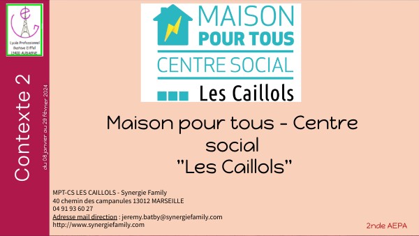 Maison Pour Tous "Les Caillols", il s'agit d'un équipement social communal, propriété de la Ville de Marseille géré en délégation de service public par Synergie Family depuis 2018. Le territoire sur lequel est situé cet équipement social est prioritaire et relève en partie de la Politique de la Ville. Afin de répondre à un besoin du territoire, la direction de la MPT a rédigé un projet social afin d'obtenir l'agrément CENTRE SOCIAL par la CAF. Cet agrément permet l'obtention de financements supplémentaires et permet également de bénéficier d'un accompagnement par un référent famille (travailleur social de la CAF) pour conduire le projet famille en adéquation avec le projet social .