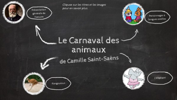 Le Carnaval des animaux est une oeuvre pour ensemble instrumental composée en 1886 par Camille Saint-Saëns.Lien vers la page Wikipédia de l'oeuvre