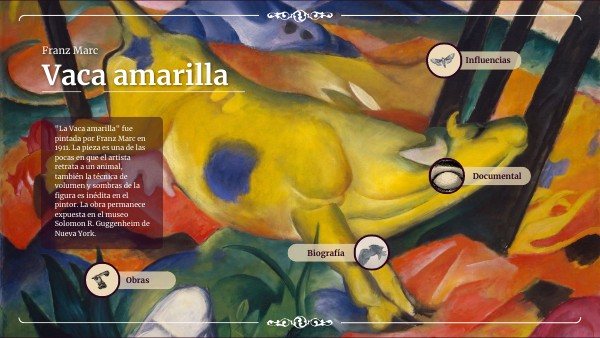 "La Vaca amarilla" fue pintada por Franz Marc en 1911. La pieza es una de las pocas en que el artista retrata a un animal, también la técnica de volumen y sombras de la figura es inédita en el pintor. La obra permanece expuesta en el museo Solomon R. Guggenheim de Nueva York.